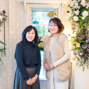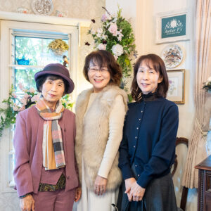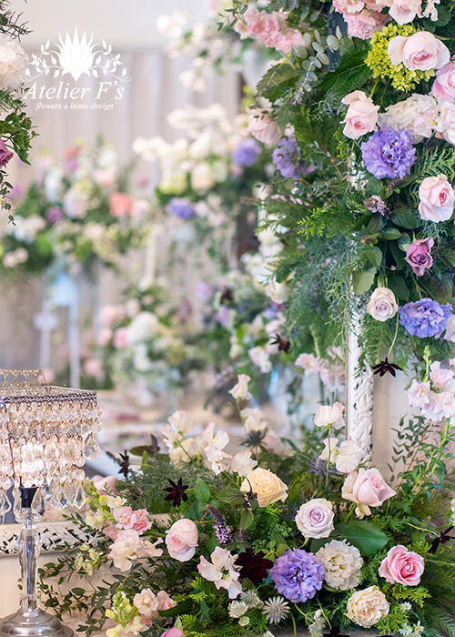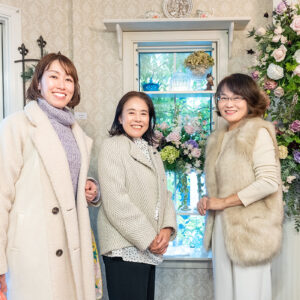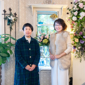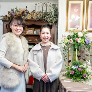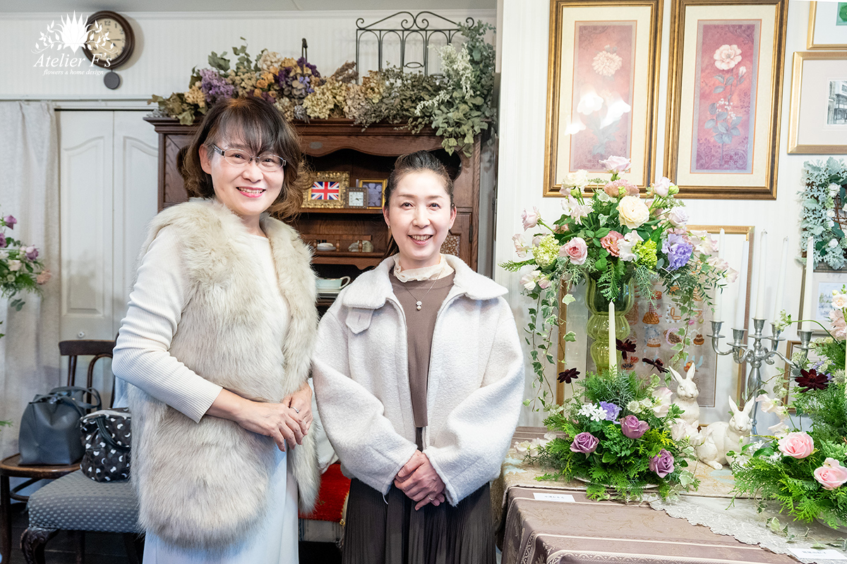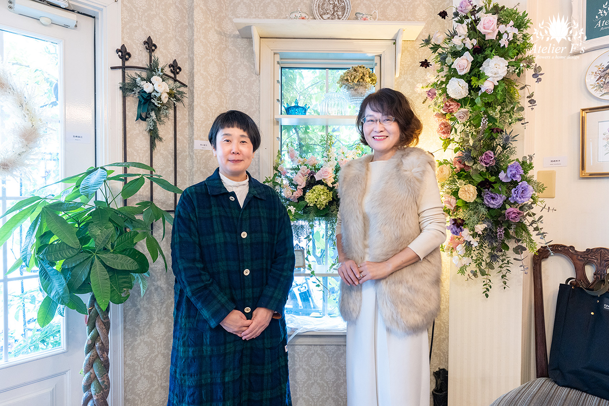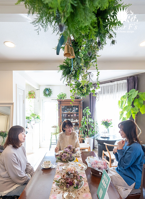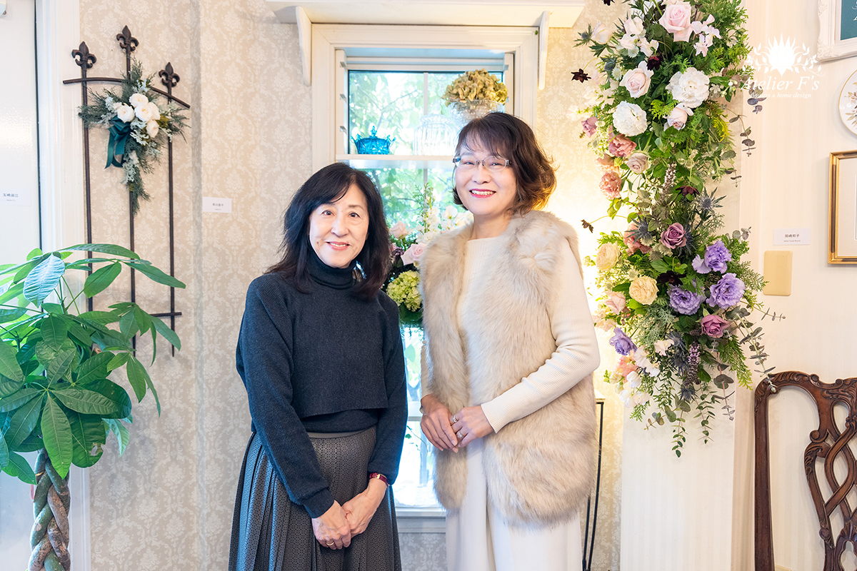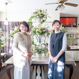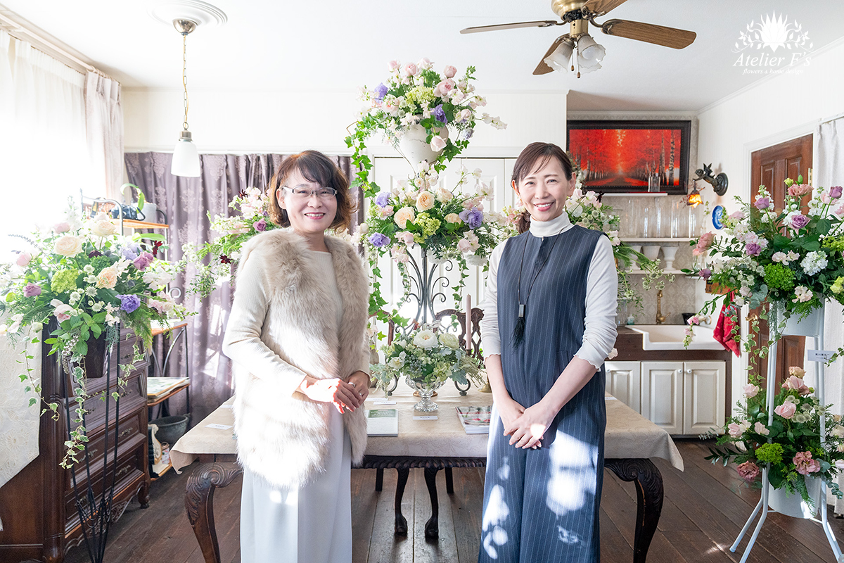 優しく上品な花々を用いた作品の数々に包まれたアトリエは、まるでイギリスのマナーハウスを訪れたかのような、気品あふれる優雅な空間でした。