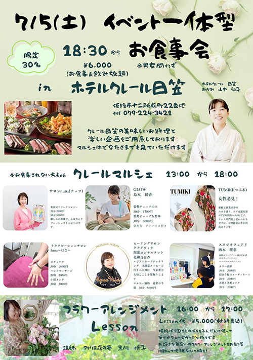 2025年7月5日(土)にアトリエ花の夢の黒川博子先生が、ホテルクレール日笠のクレールマルシェにて、フラワーアレンジメントのイベントレッスンを担当されました。