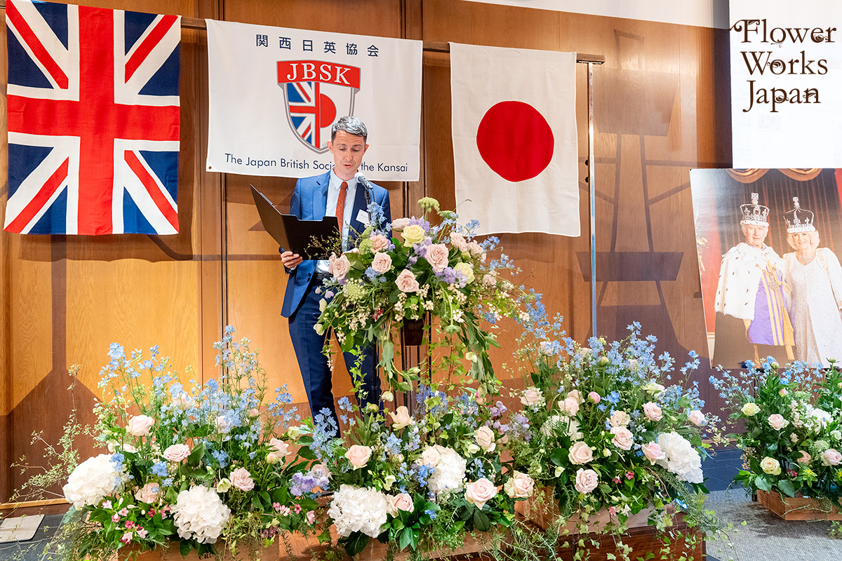 ブライス英国領事もご列席いただき、檀上の装花の前でスピーチをしていただきました。