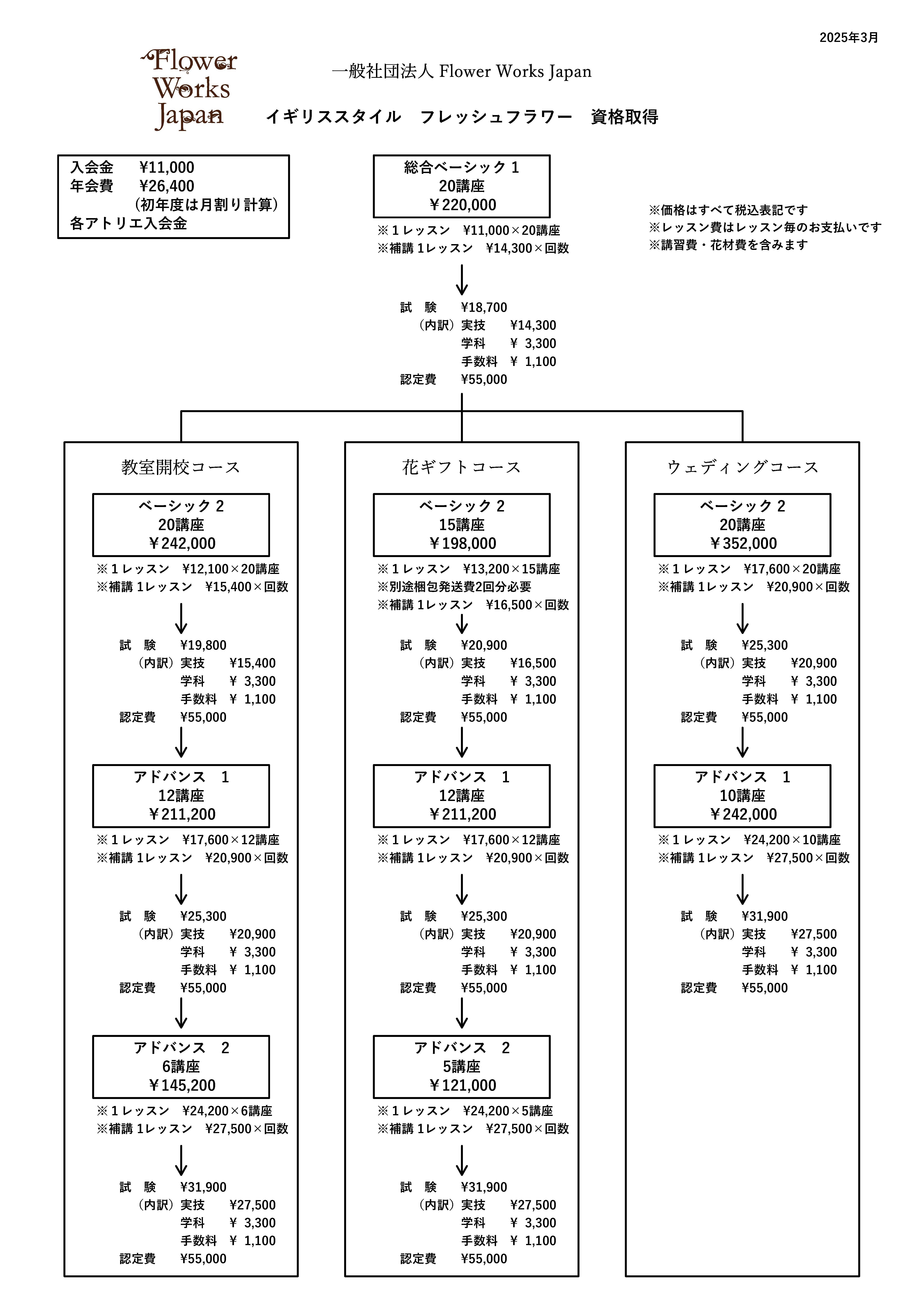 一般社団法人Flower Works Japan認定校に入会していただくことで、レッスンを受けていただくことができます。イギリススタイルを基本に、お花のあわせ方や花器の合わせ方など基礎からしっかり学びます。
